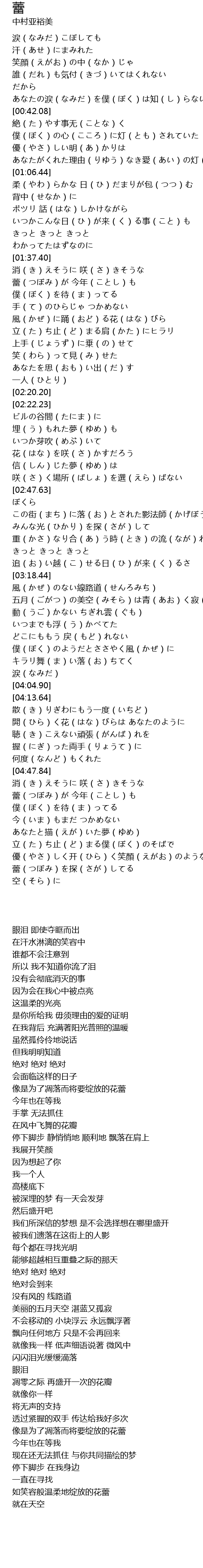 | [05:21.63] | 蕾(つぼみ)を探(さが)してる |