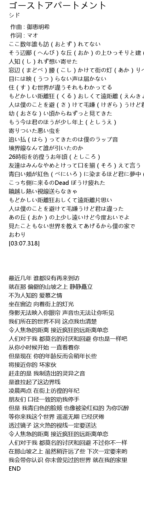 | [01:21.456] | 追い払(はら)ってきたのは僕のラップ音 |