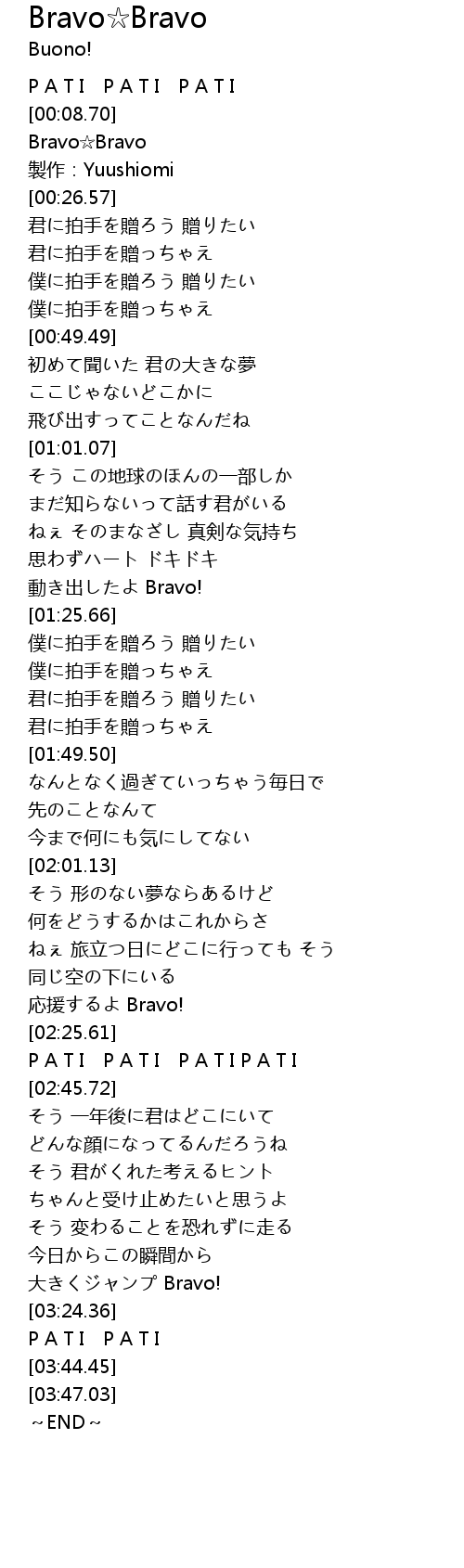 | [02:22.60] | 応援するよ Bravo! |