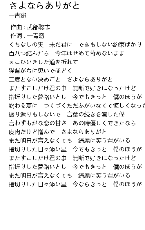 | [03:23.940] | 指切りした日々添い星 今でもきっと 僕のほうが |