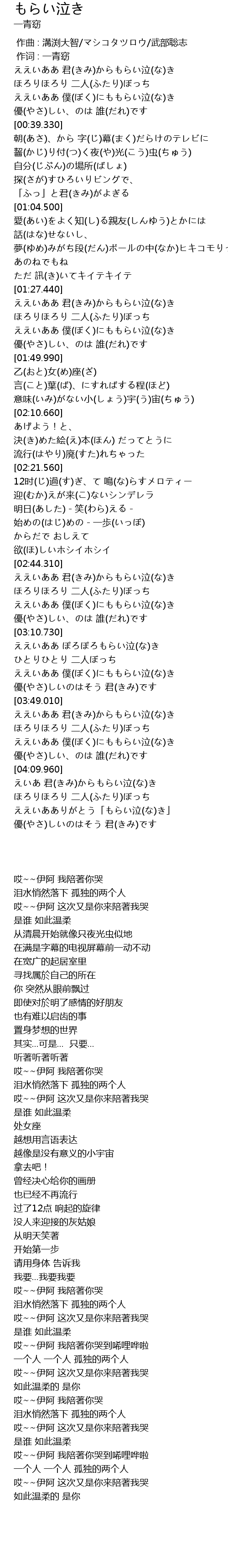 | [04:21.190] | ええいあありがとう「もらい泣(な)き」 |