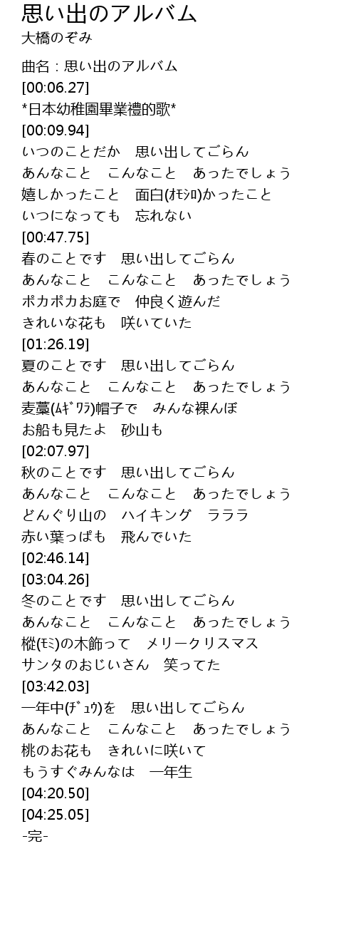 | [03:42.57] | 一年中(ヂュウ)を 思い出してごらん |