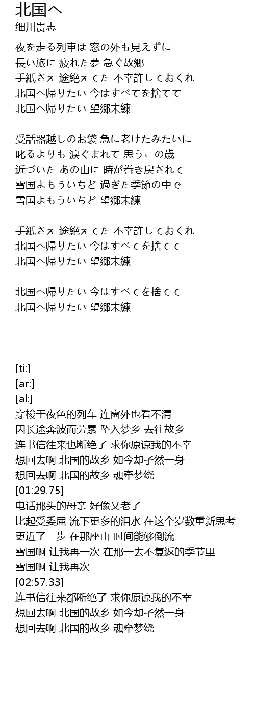 | [01:15.66] | 想回去啊 北国的故乡 魂牵梦绕 |