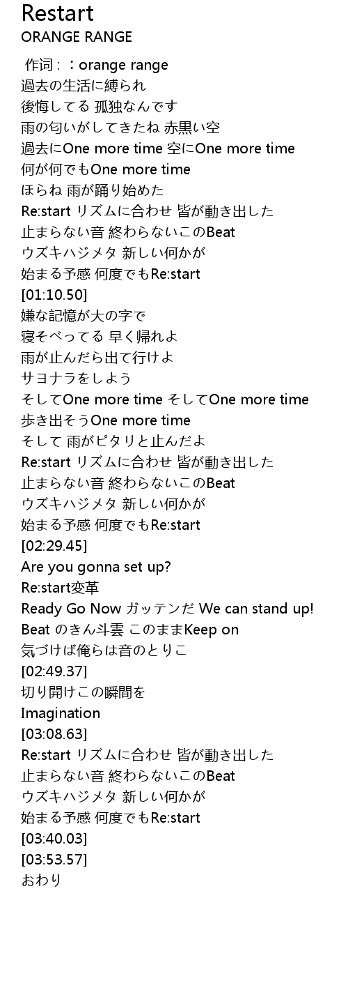 | [03:10.98] | Re:start リズムに合わせ 皆が動き出した |