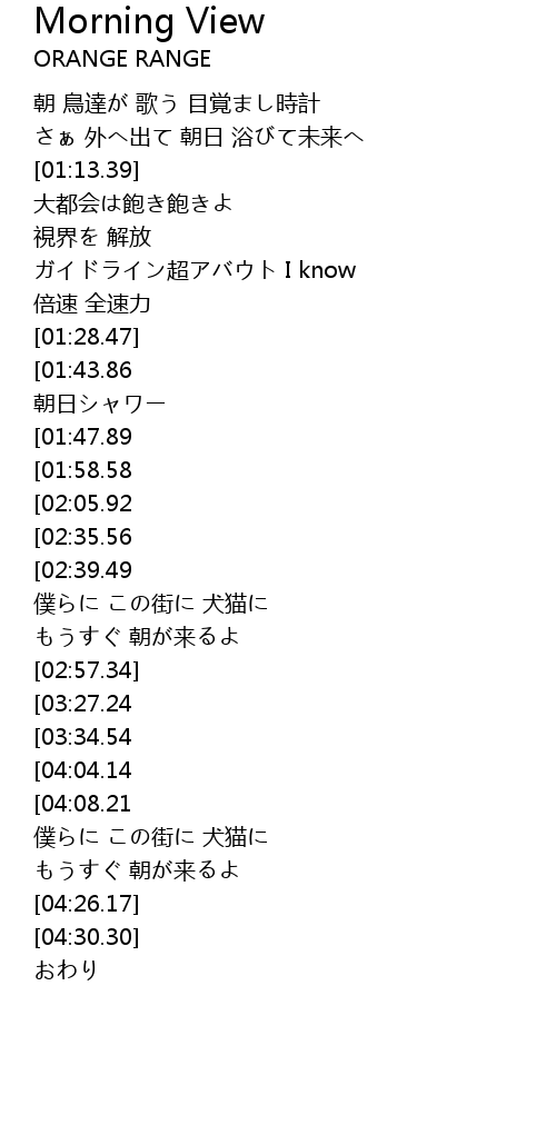 | [02:42.86][02:35.56][02:28.13] | はじまり 告げるよに 朝日シャワー |