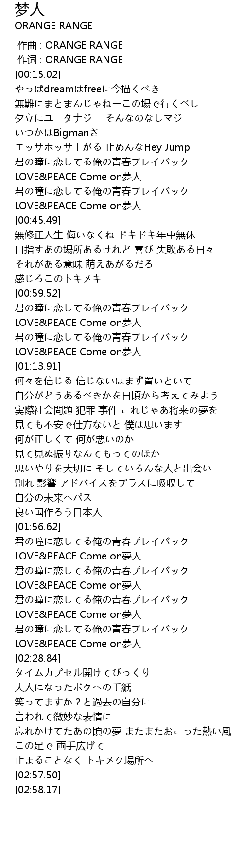 | [02:25.49] | LOVE&PEACE Come on夢人 |