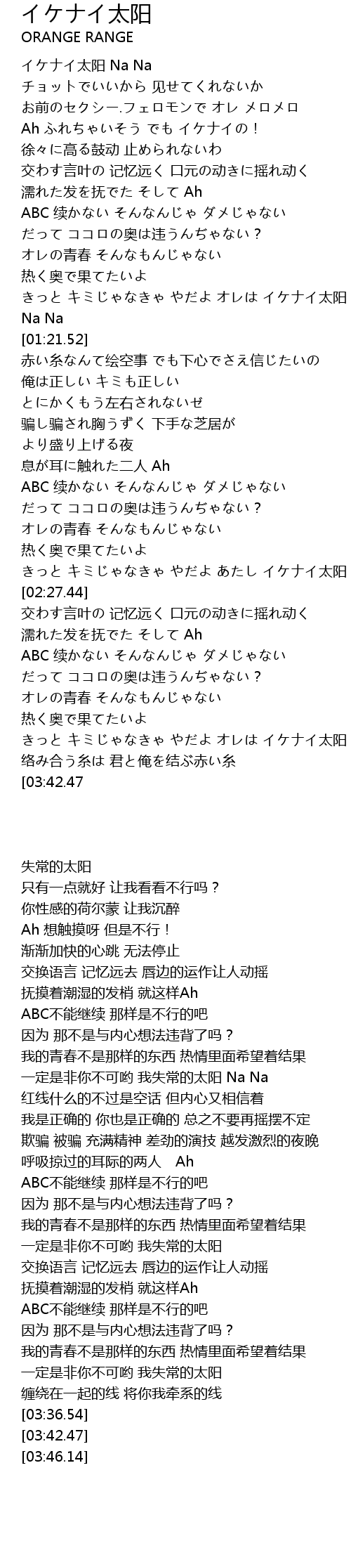 | [03:22.48] | きっと キミじゃなきゃ やだよ オレは イケナイ太阳 |