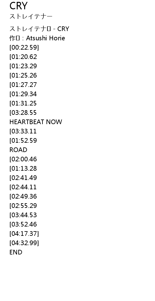 | [03:36.44][03:28.55][01:48.66][01:32.71][00:52.63][00:36.70] | LISTEN TO MY HEARTBEAT NOW |