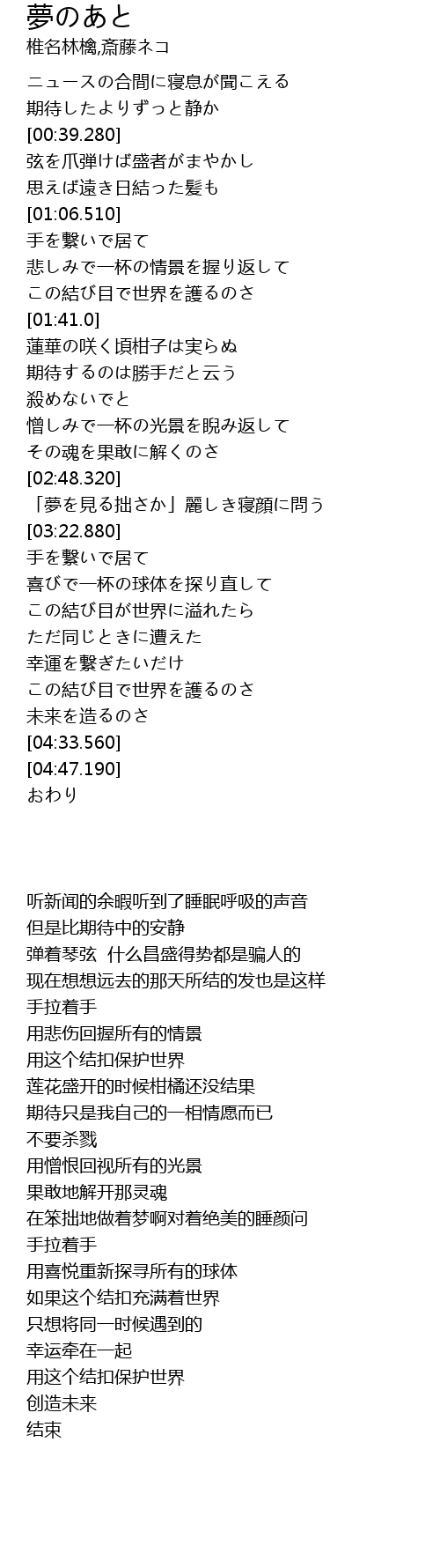 | [02:56.750] | 「夢を見る拙さか」麗しき寝顔に問う |