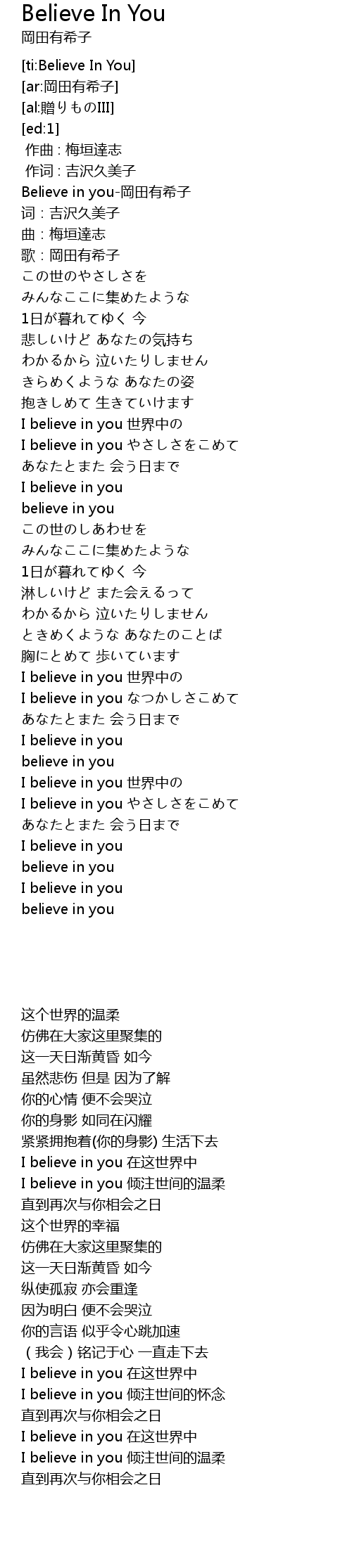 | [03:27.500] | I believe in you 倾注世间的温柔 |