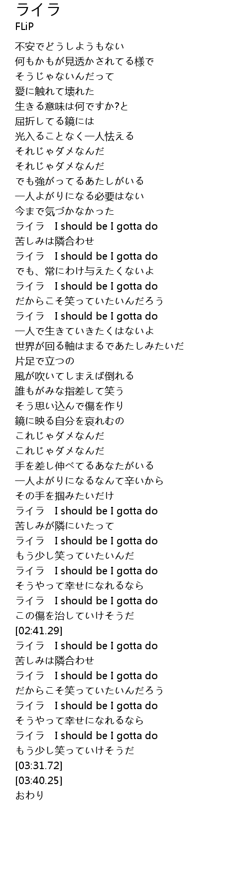 | [02:28.84] | ライラ I should be I gotta do |