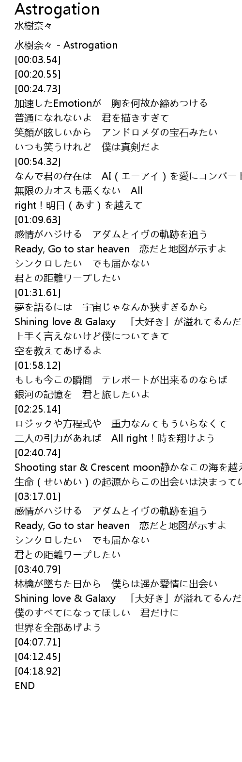 | [00:41.40] | 笑顏が眩しいから アンドロメダの宝石みたい |