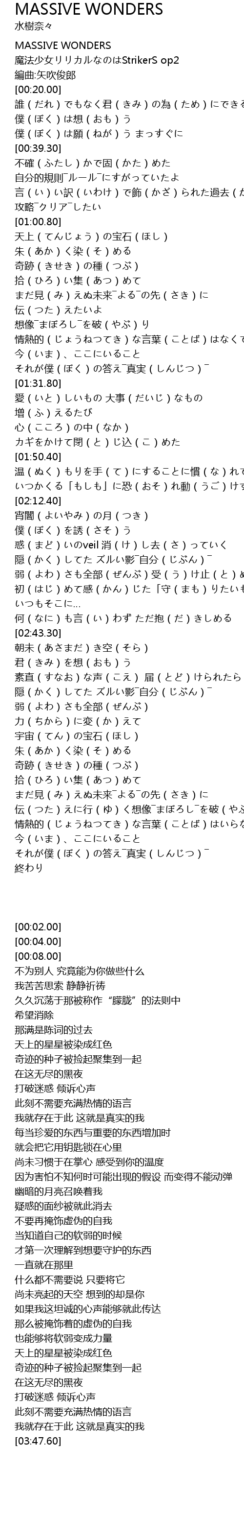 | [03:21.34] | 奇跡(きせき)の種(つぶ) 拾(ひろ)い集(あつ)めて |