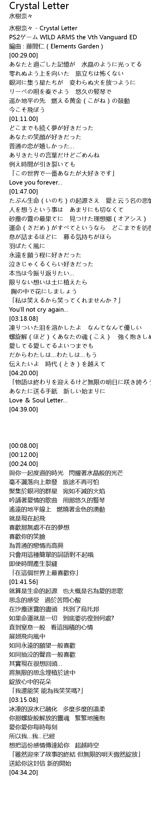 | [00:08.00] | 水樹奈々 - Crystal Letter |