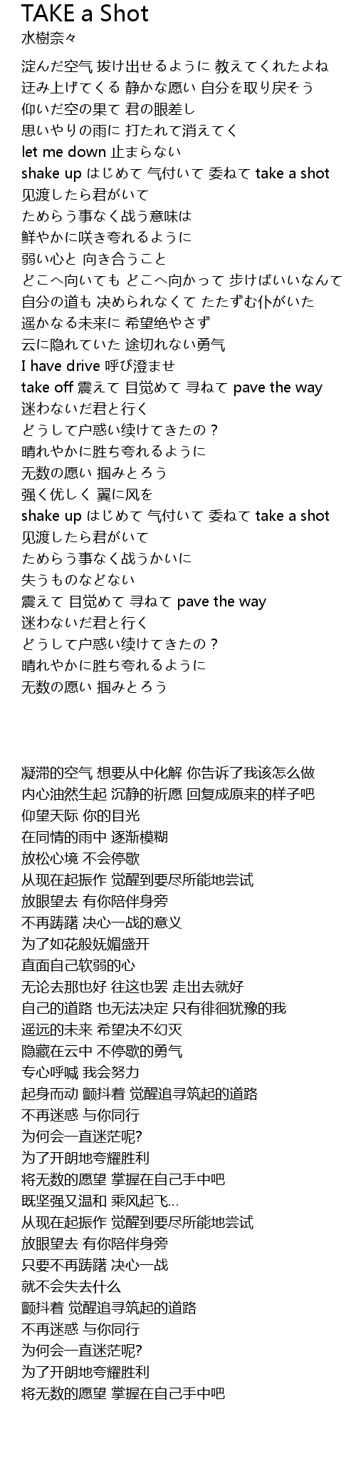 | [03:17.950] | shake up はじめて 气付いて 委ねて take a shot |