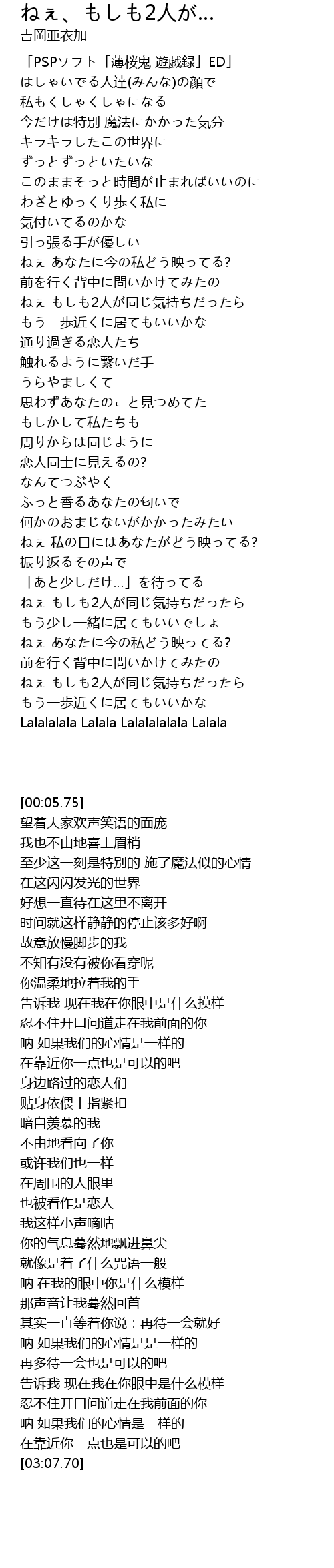 | [02:05.66] | ねぇ もしも2人が同じ気持ちだったら |