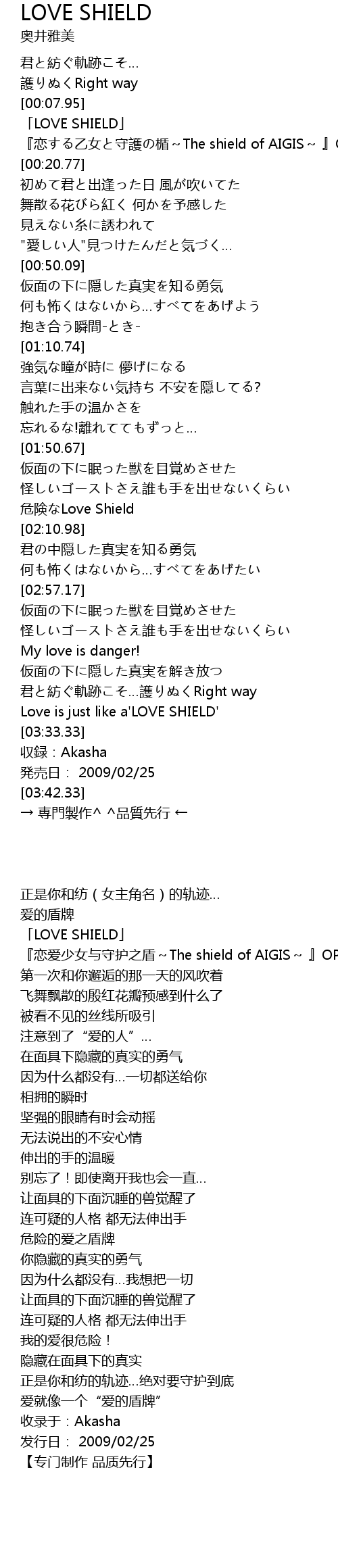 | [03:29.56] | Love is just like a'LOVE SHIELD' |