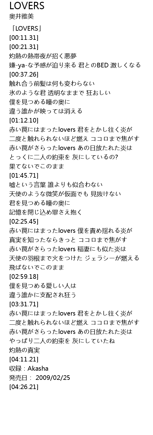 | [03:34.29] | 赤い罠にはまったlovers 君をとかし往く炎が |