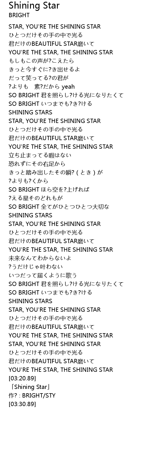 | [03:17.88] | YOU' RE THE STAR, THE SHINING STAR |