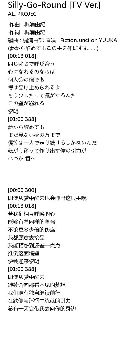 | [00:00.300] | 編曲 : 梶浦由記 原唱 : FictionJunction YUUKA |