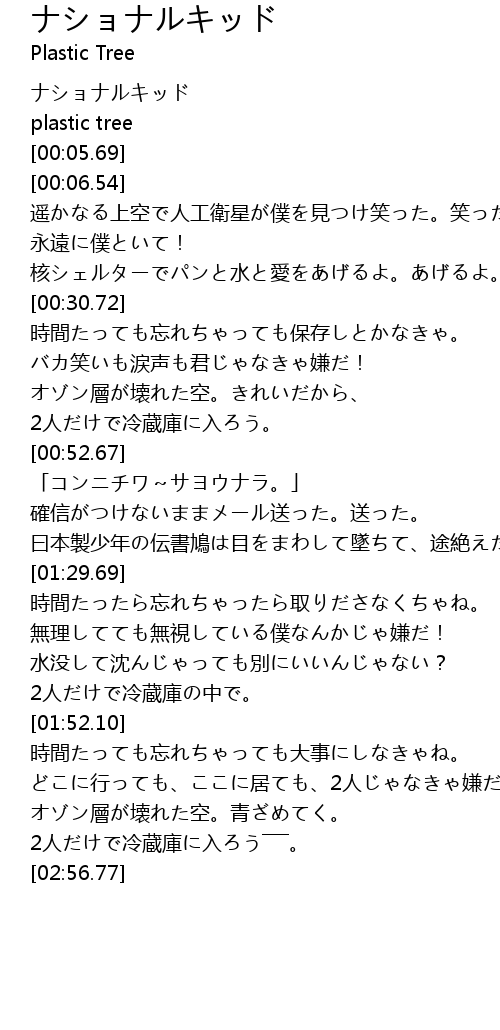 | [00:10.88] | 遥かなる上空で人工衛星が僕を見つけ笑った。笑った。 |