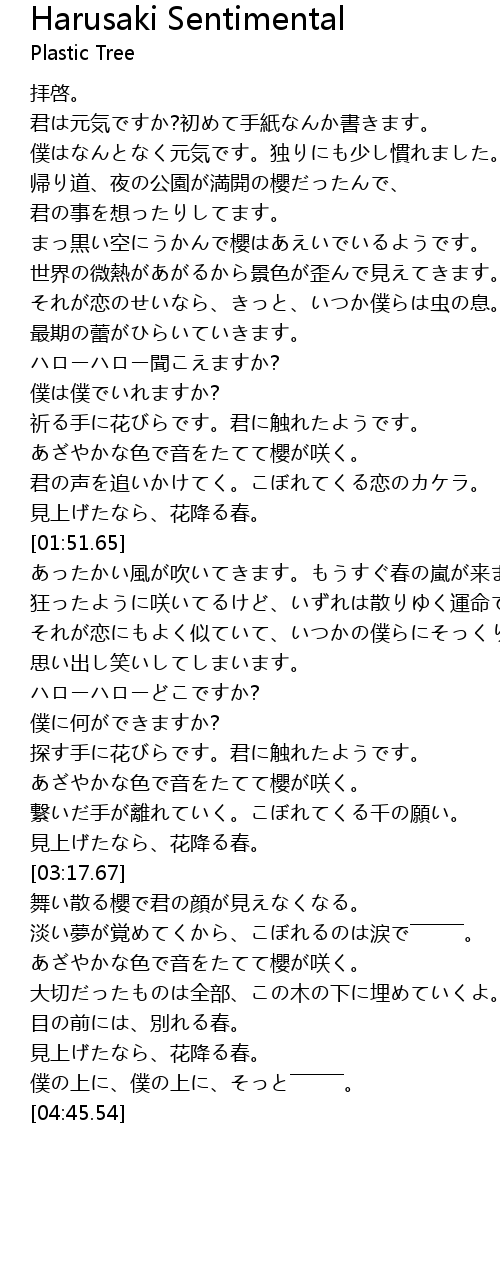 | [01:42.35] | 見上げたなら、花降る春。 |