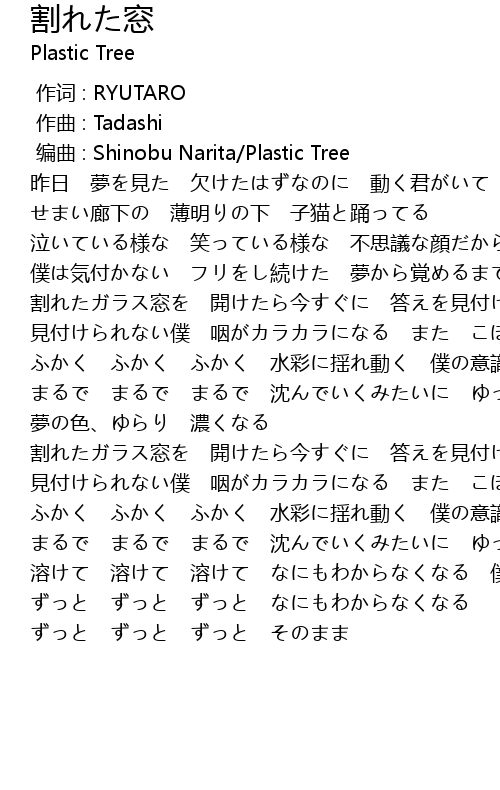 | [00:02.000] | 编曲 : Shinobu Narita/Plastic Tree |