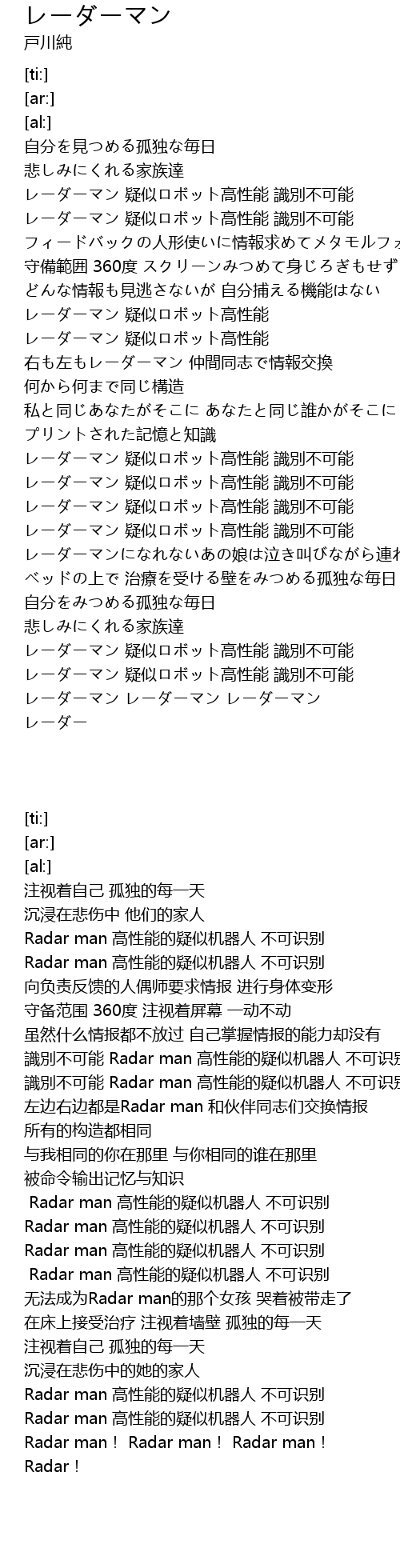 | [01:03.72] | 識別不可能 Radar man 高性能的疑似机器人 不可识别 |