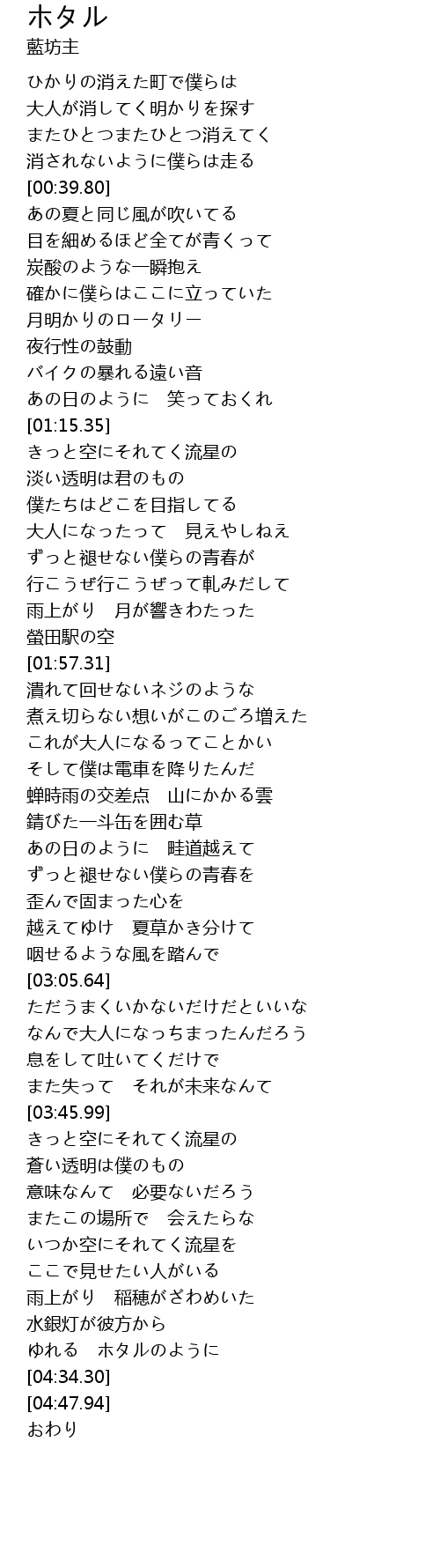 | [00:20.36] | ひかりの消えた町で僕らは |