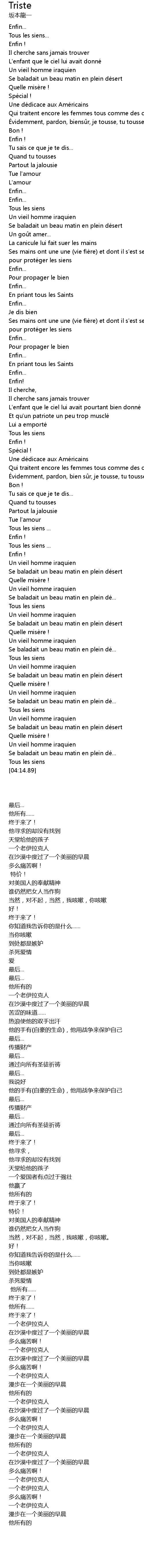 | [02:06.33] | Ses mains ont une une (vie fière) et dont il s'est servi de la guerre pour protéger les siens |