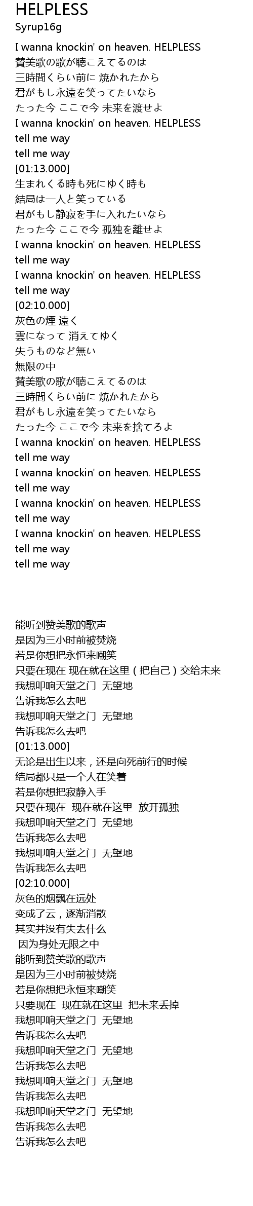 | [00:56.490] | I wanna knockin' on heaven. HELPLESS |