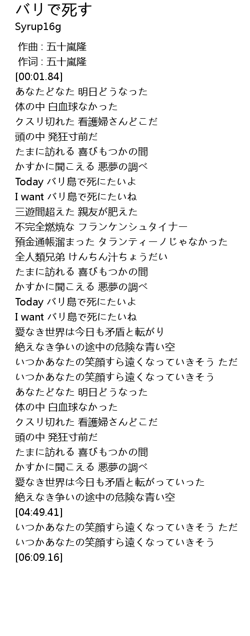 | [00:53.73] | Today バリ島で死にたいよ |