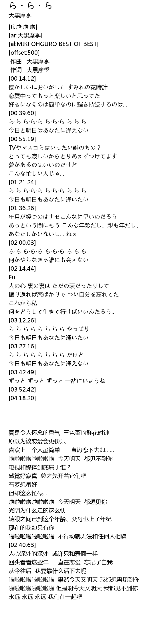 | [00:41.42] | ら·ら ら·ら·ら ら·ら·ら ら·ら·ら 今日と明日はあなたに逢えない |