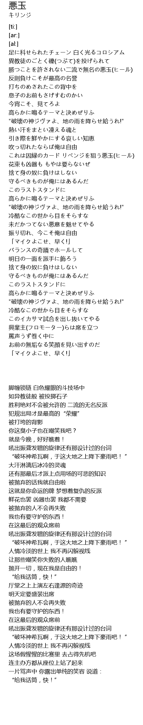 | [00:24.39] | 勝つことを許されない二流で無名の悪玉(ヒール) |