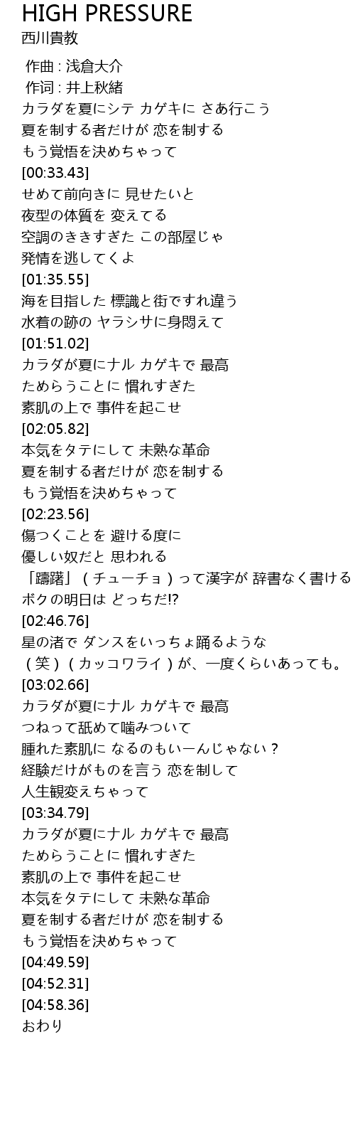 | [04:18.11] | カラダが夏にナル カゲキで 最高 |