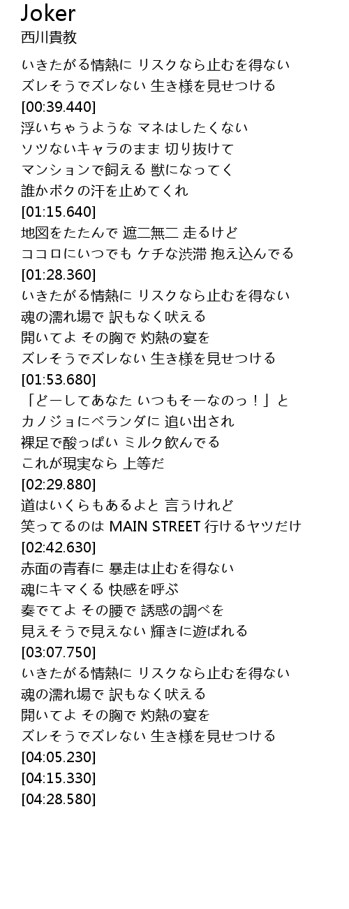 | [02:36.190] | 笑ってるのは MAIN STREET 行けるヤツだけ |