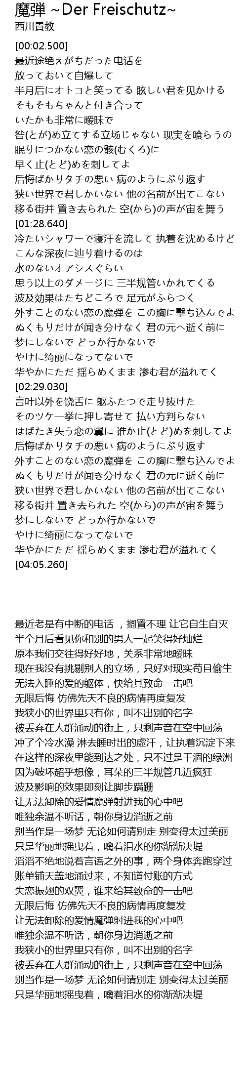 | [03:23.060] | 让无法卸除的爱情魔弹射进我的心中吧 |
