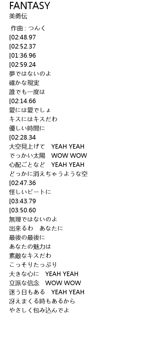 | [01:40.37][03:50.60] | すべてを包み込んでよ ファンタジー |