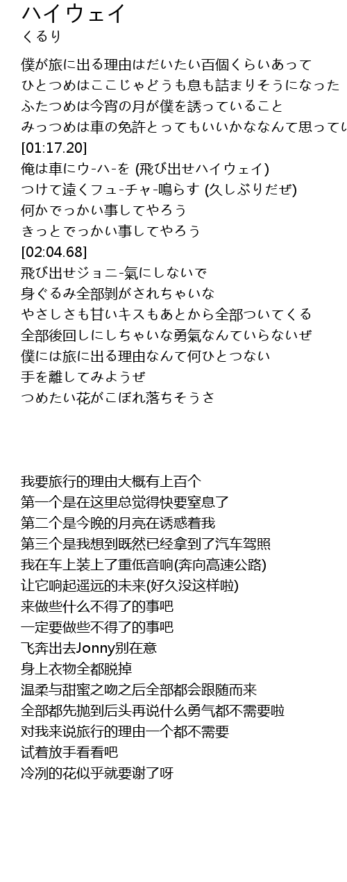 | [01:32.84] | 俺は車にウ-ハ-を (飛び出せハイウェイ) |