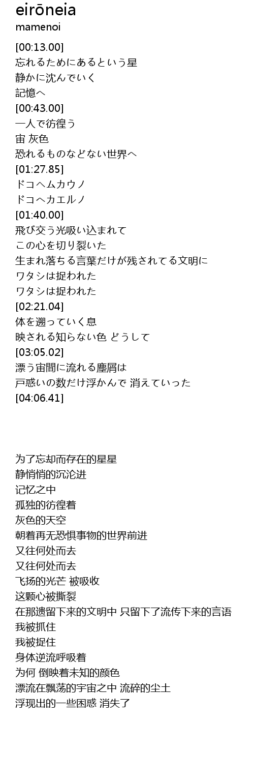 | [03:05.31] | 漂う宙間に流れる塵屑は |
