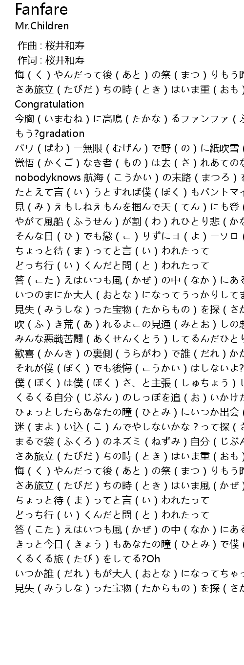 | [00:47.107] | Congratulation 今胸(いまむね)に高鳴(たかな)るファンファ(ふぁんふぁ)ーレ(れ) |