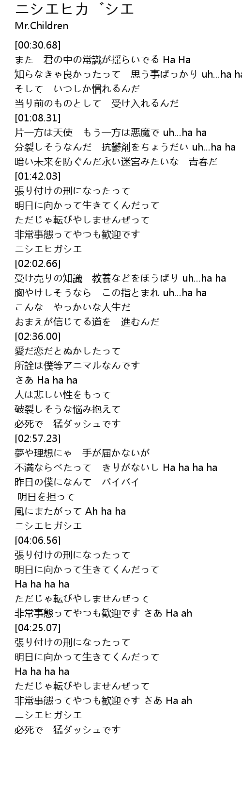 | [04:01.15] | ニシエヒガシエ |