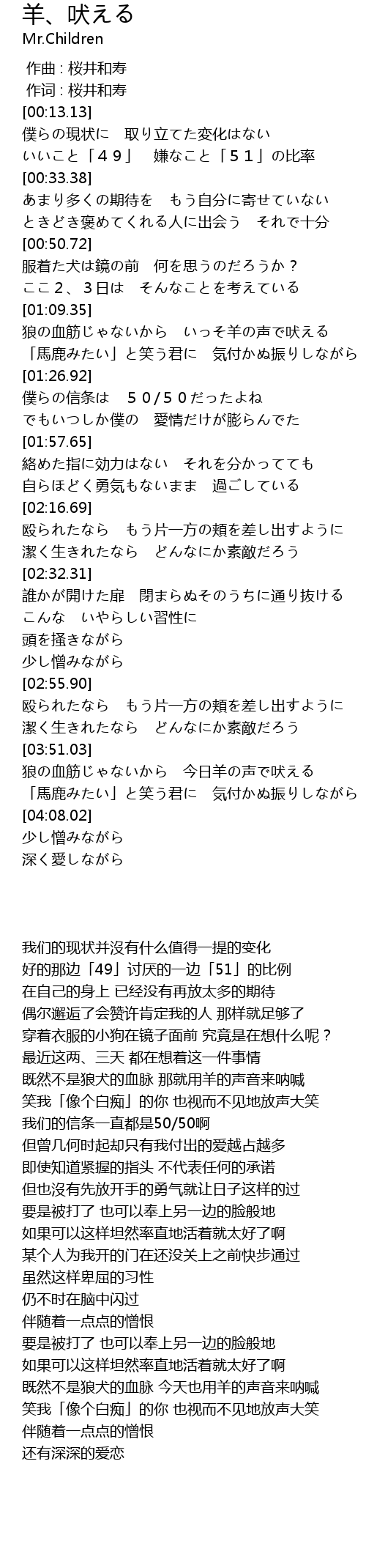 | [03:53.03] | 既然不是狼犬的血脉 今天也用羊的声音来呐喊 |