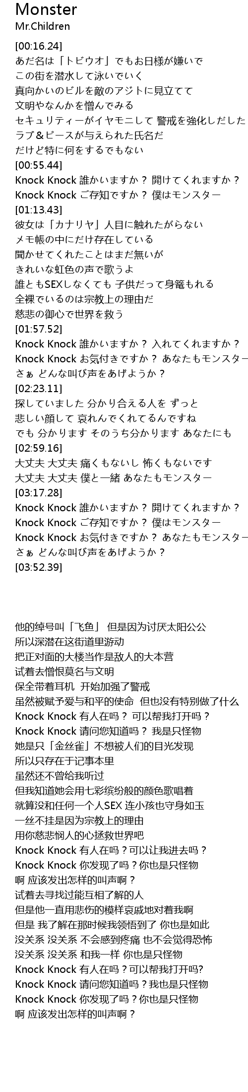 | [01:03.94] | Knock Knock ご存知ですか? 僕はモンスター |