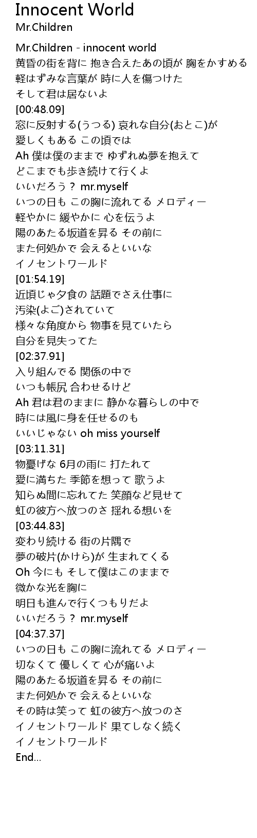 | [05:16.17] | イノセントワールド 果てしなく続く |