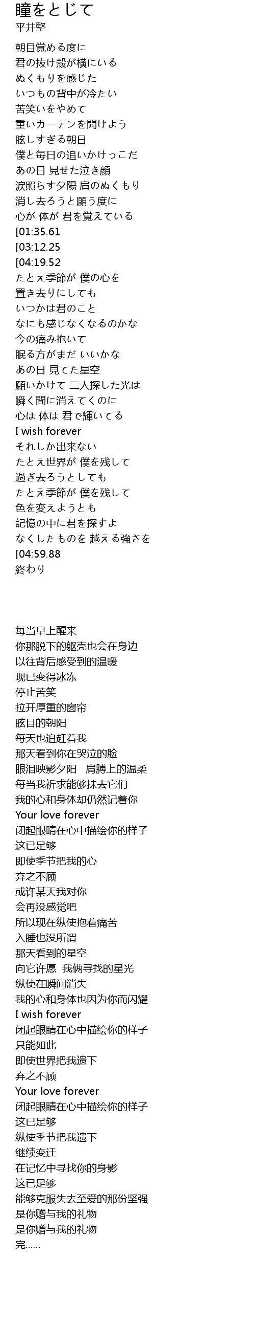 | [04:12.86][03:12.25][01:37.92] | 瞳をとじて 君を描くよ |