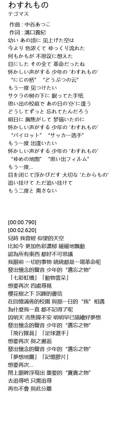 | [02:33.239] | 怀かしい声がする 少年の 'わすれもの' |