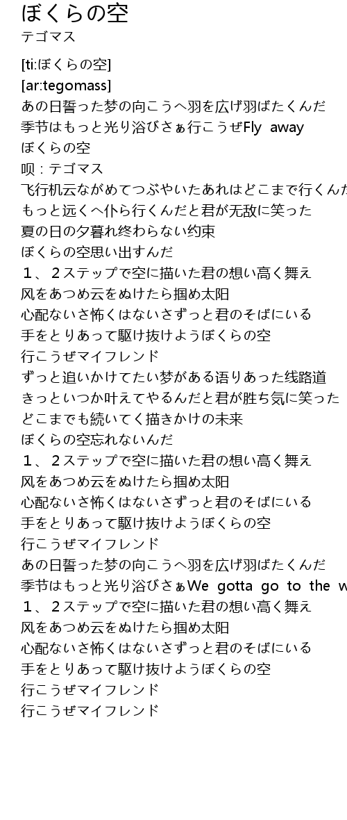| [02:23.914] | 手をとりあって駆け抜けようぼくらの空 |