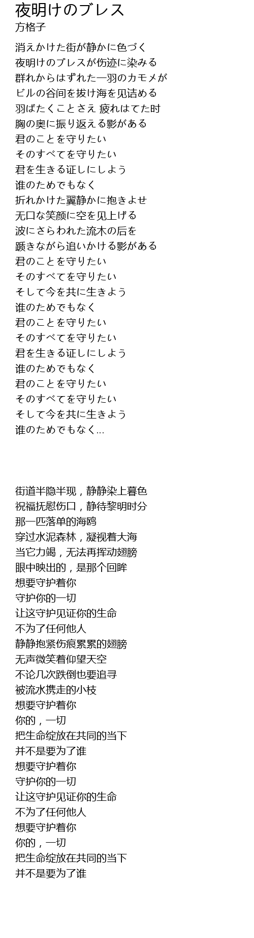 | [00:20.000] | 夜明けのブレスが伤迹に染みる |