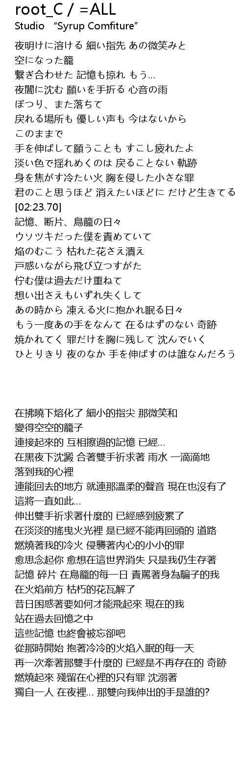 | [02:43.02] | 記憶、断片、鳥籠の日々 ウソツキだった僕を責めていて |